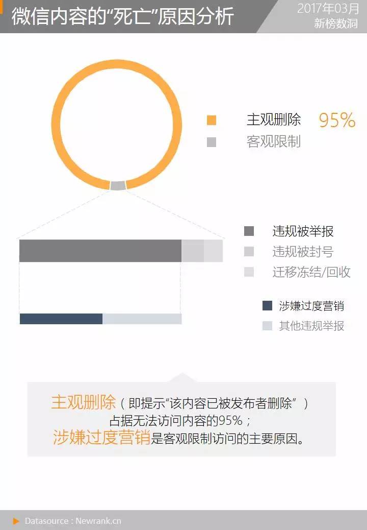 当访问状态变为无法查看时,微信公众平台通常会在页面上告知无法访问的原因。这些原因可从宏观上分为两类,一类是被公众号运营者主动删除(此时在页面上提示:该内容已被发布者删除);另一类是被微信公众平台客观限制用户访问,通常是内容违规或者操作公众号迁移功能所造成。数据表明,95%无法访问的内容是被运营者主动删除。而在剩余被平台客观限制访问的5%内容中,有约80%是因为内容违规遭用户举报,其中用户举报最多的原因为:涉嫌过度营销,骚扰用户。