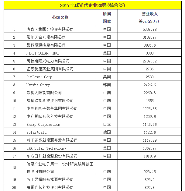 附表:2017全球光伏企业20强(综合类)