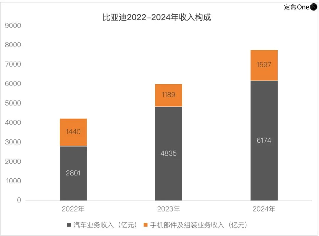 比亚迪2022年和燃油车彻底切割,业务结构大变,从那一年到2024年,汽车销量从186万辆涨至427万辆,汽车业务收入占比从76%升至80%,公司也越来越赚钱。