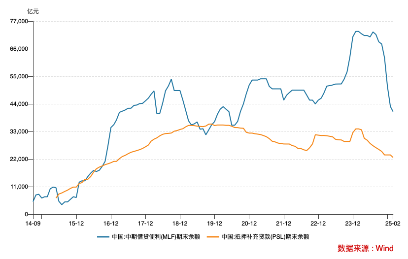 未来MLF余额可能进一步下降或归零。去年下半年,买断式逆回购、国债净买入已逐步置换MLF,今年2月末MLF余额已降至4.1万亿,相比峰值下降3万亿。随着MLF利率的政策属性完全退出及招标方式的变化,这一趋势可能还会持续。