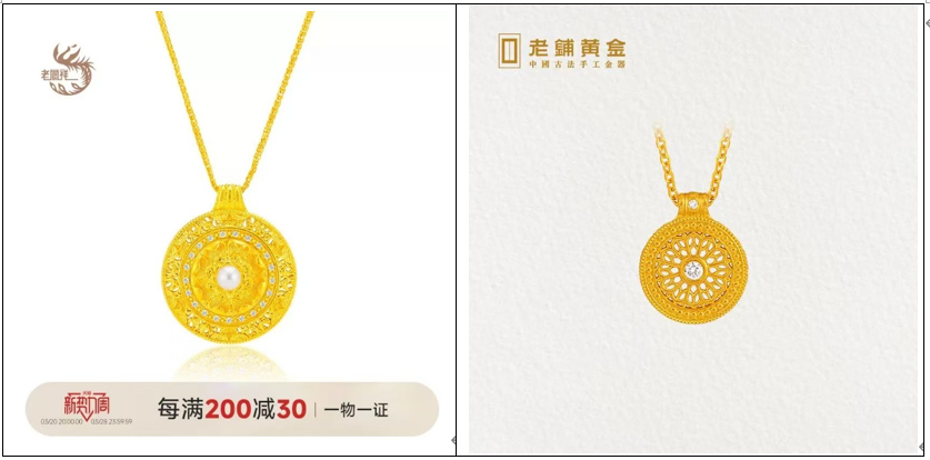 首先,老铺黄金产品内涵方面仍不具有奢侈品的辨识度。与诸如梵克雅宝的“四叶草”系列、卡地亚Love手镯等具有全球辨识度的经典款不同,老铺黄金的产品线虽涵盖吊坠、手镯、戒指等十余个品类,却缺乏标志性设计元素,这也导致其易于被仿制。