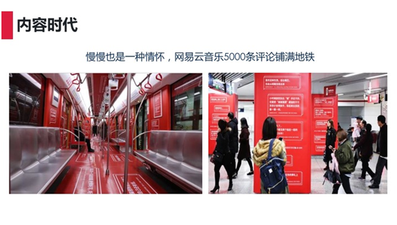 网易云音乐选择了一些网友评论,把它们展示在杭州的地铁上,这件事引起了朋友圈的转发,也许很多人会觉得这是一个营销策划活动,但其实是网易云音乐的内容运营多年的积累和沉淀。在这个列车上真正感动到大家的是那些温暖的文字,并且引起了共同情感,这才是内容运营的核心所在。