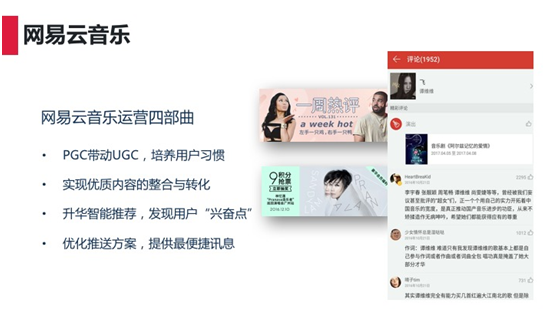 另外网易音乐云还做了优质内容的整合和转化,把每周热门优质的评论做一个合集推送给用户,让用户不断的在网易云音乐里面获得温暖。大家听音乐的起因不同,有的是心情不太好,或者是下班的时候,或者是运动的时候,所以云音乐要做的就是给大家非常好的场所,你留过的评论定将会给另外一些用户带来温暖。