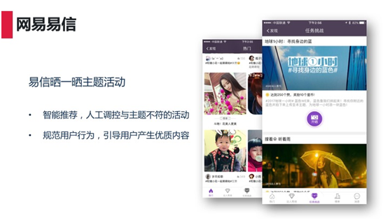 易信晒一晒主题活动,如果有些主题用户刚发出来就把它删除掉,那么之后用户就很难再发这种类型的主题。所以我们需要有这样的部落、这样的情怀。如果说帖子和主题不符合,那么也会相应的做一些处理,同时也会有一些准则告诉用户,哪些信息受欢的,哪些是不受欢迎的。