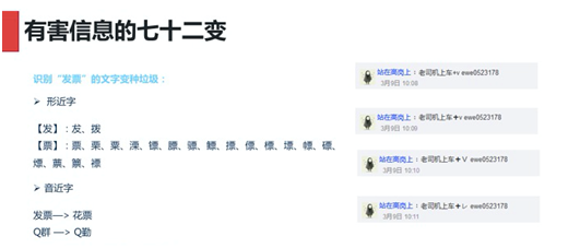 为了保证用户第一时间看到的不是有害信息,我们会对这些信息做一个辨令,比如说QQ群的近音字“QQ勤”。我们会去做一些辨别,对这些内容做一个梳理。有人说这种情况做一个关键词就好了,关键词的问题在于简单粗暴,会存在正常语境的情况,比如 “口交” →“24口交换机”?所以这时候如果用很直接的方式的话,用户的体验是非常糟糕的。所以我们会把中国的汉字进行深入研究,包括中文语法的研究、汉字的研究,目的就是为了抗干扰。