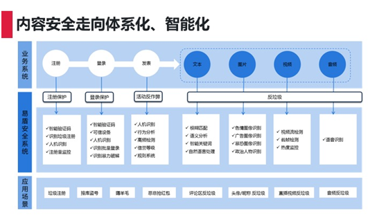 但最终整套安全是要走向体系化和智能化(注册保护、登录保护、活动反作弊、反垃圾等)。很多运营刚开始的时候会提倡注册量,之后看到很多疑似垃圾注册的数据,具体表现为随机产生的无意义字符串,但是当这些账号没有产生交互行为,处理时的依据在哪里?处理后面对用户来申诉你的理由是什么?因此我们需要借助成熟的人机识别技术进行甄别,从科学的角度识别机器人与自然人。此外,在法律依据上,这是一种属于破坏计算机系统的行为(具体参阅中华人民共和国刑法286条)。有了科学依据、法律依据后,我们便有依可据了了。同样,我们还有登陆保护,一环扣一环。注册保护、登录保护、反作弊都是基于人机识别,而反垃圾就是从内容的维度进行保护。试想,黑灰产想要低成本提高利润只能借助非法工具,其最终的目的是商业利益(内容上表现为恶意推广),因此多一重保护,就是增加黑灰产的成本。