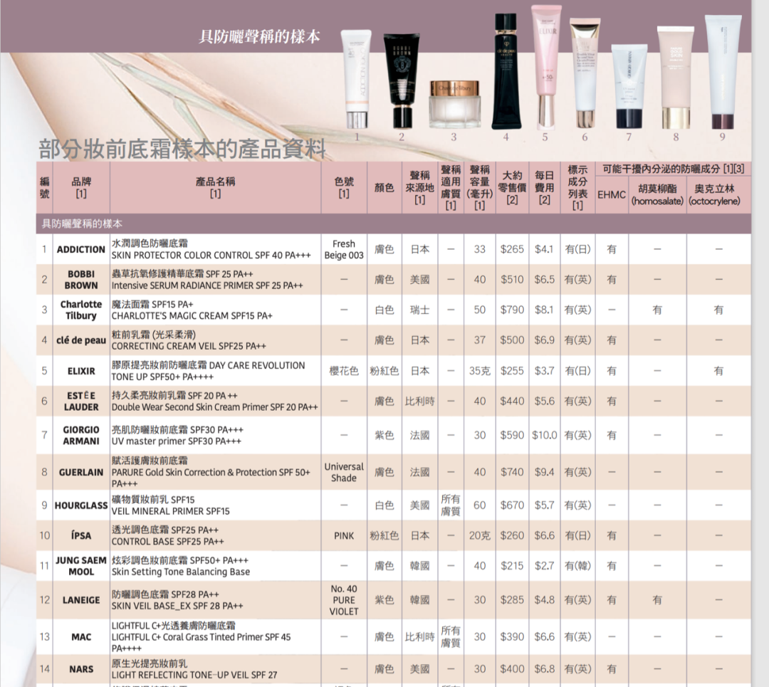 为保障此次检测的公正性,香港消委会分别从百货公司、美容用品专卖店以及网上商店等渠道,购买了37款妆前底霜作为研究样本,每支售价大约在100元至928元之间。这些产品中不乏阿玛尼、NARS、SUQQU、资生堂等耳熟能详的美妆品牌。