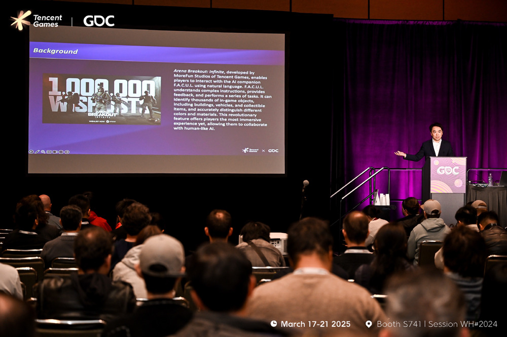 在NPC训练与交互方面,魔方工作室分享《F.A.C.U.L:首个懂人类语言的 FPS AI 队友》,项目融合语音输入、大语言模型、实时文本转语音等生成式AI技术,让玩家能与AI队友沉浸式协同作战。腾讯游戏魔方工作室AI项目负责人廖詩颺介绍,《暗区突围》打破了传统FPS游戏中玩家只能通过快捷热键向AI下达简单指令的限制,使AI队友能理解复杂指令,还可以识别游戏中的数千种物体,包括建筑、载具和可收集物品,更好配合玩家。