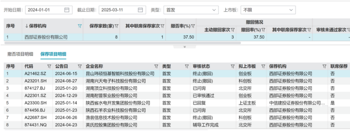 西部证券投行业务业绩断崖式下跌系多重因素所致。首先,股权融资业务遭遇寒冬,2024年上半年西部证券未能完成任何IPO保荐项目,由西部证券保荐的8家企业中,有3家因撤回上市申请而终止发行,分别是昆山玮硕恒基智能科技股份有限公司、湖南兴天电子科技股份有限公司和渔翁信息技术股份有限公司,IPO撤否率达37.5%。其次,债券承销业务也未能挽救颓势,未能为公司贡献显著收入。此外,并购重组业务依旧低迷,无法填补其他业务线的亏损缺口。