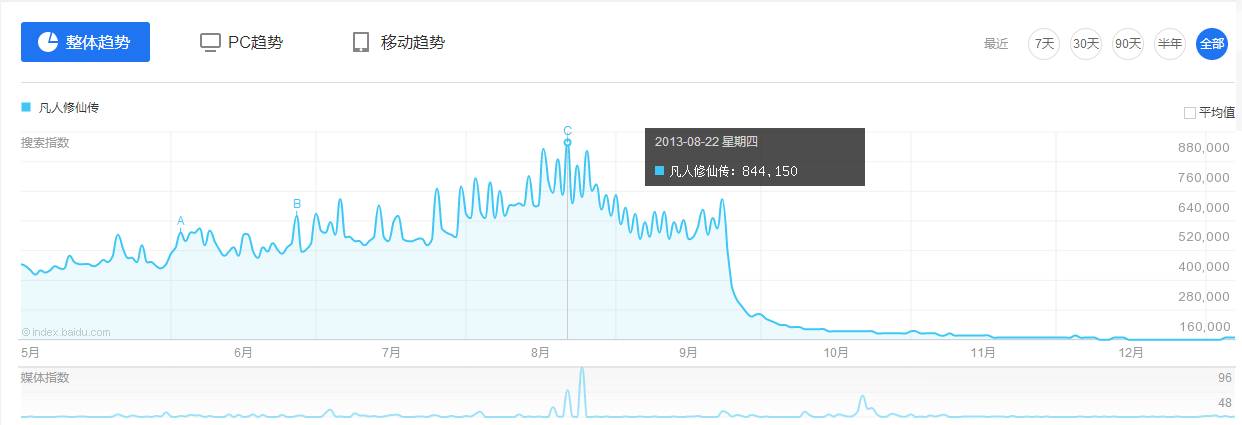 根据百度指数显示,《凡人修仙传》在2013年8月22日达到了最高峰——84万,还是有相当高的人气,不少人都有过听闻。近些年来也推出过网游、页游,手游上也有多次授权,但这一次是原作者忘语亲自担任游戏监制一职。