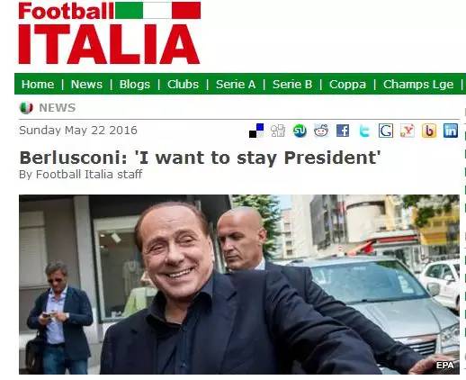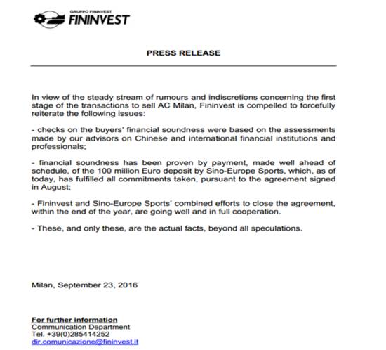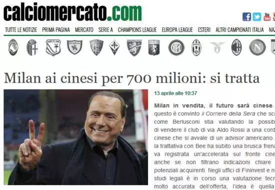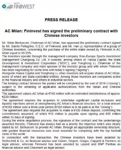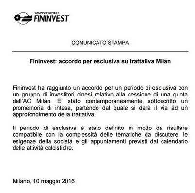 2016年5月10日,据意大利《米兰体育报》、《罗马体育报》等权威媒体的消息,AC米兰俱乐部所属的菲宁维斯特集团已经同中国财团达成了排他性的销售协议,这意味着双方将正式开启收购谈判,也意味着贝卢斯科尼目前将只同中国财团对话,米兰官方也发布通告确认了这一消息的真实性。
