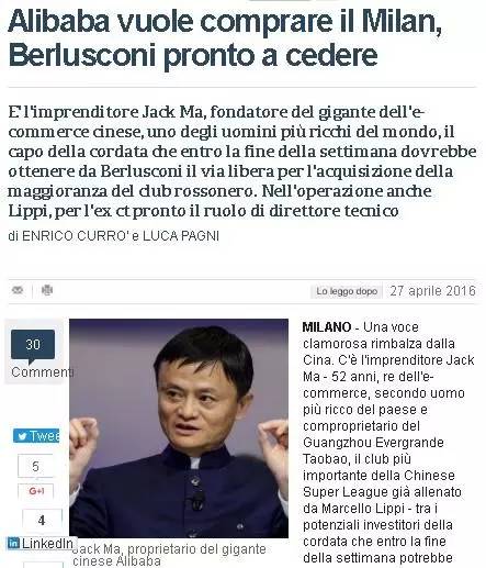 2016年4月27日,据意大利媒体《共和报》消息,阿里巴巴创始人、恒大俱乐部老板之一马云也向米兰发出了报价,而且通过了贝卢斯科尼家族菲宁维斯特集团公司的审查,获得了对方大开的绿灯。马云收购方案是先买进米兰俱乐部70%的股份,然后一年内收购剩下的30%,达到全部控股米兰的目的。但马云本人随即否认了收购传闻:“我已经投资了中国的一家俱乐部,AC米兰能给我什么?”