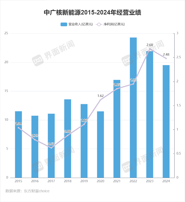 中广核新能源拥有位于中国和韩国的发电资产,装机容量占比分别为79.3%和20.7%。2024年,由于韩国燃气项目加权平均电价下跌及发电量减少,来自韩国的收入较上年度减少21%,约为9.1亿美元,但由于燃料成本下降,经营溢利表现基本持平。经营溢利即营业利润。