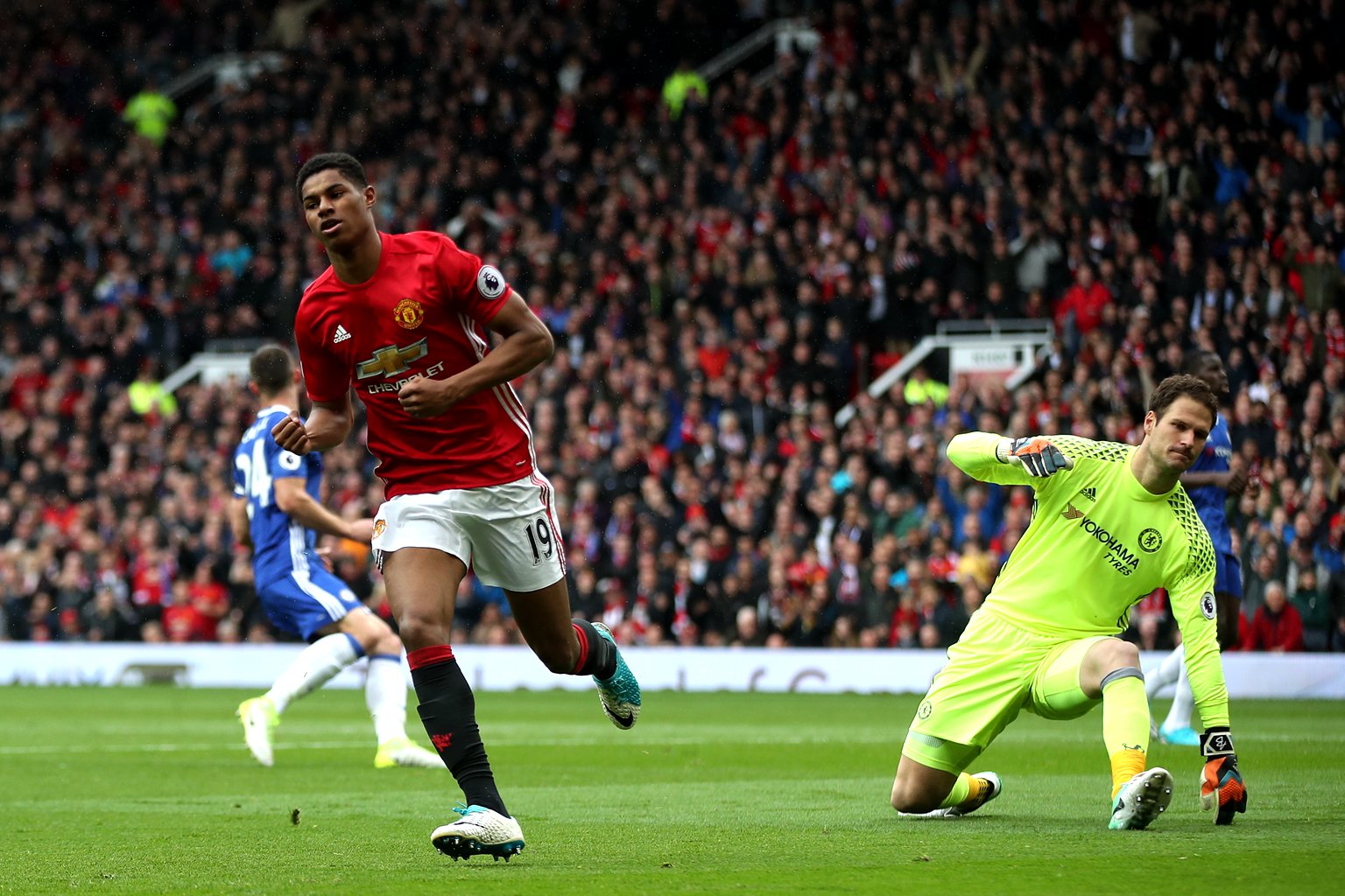 比赛开始,主场作战的曼联取得梦幻开局。第7分钟,埃雷拉中场送出直传,拉什福德利用速度摆脱大卫·路易斯,随后突入禁区右侧低射远角破门,1-0!这粒进球也是曼联本赛季的英超最快进球。此后双方各有机会,阿什利·扬和迭戈·科斯塔的远射滑门而出,加里·卡希尔的头球解围则险些自摆乌龙。