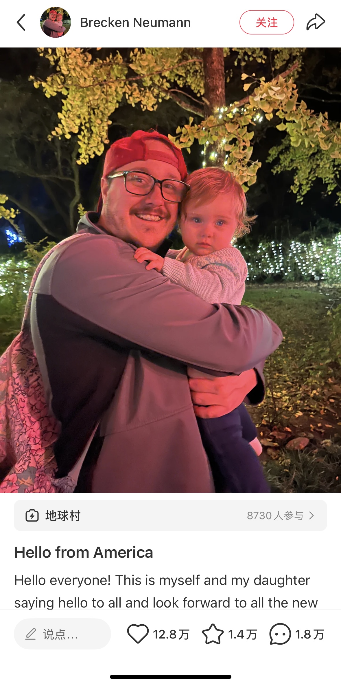 今年1月14日,美国网友布雷肯(Brecken)在小红书发布了一张自己抱着女儿的照片,同时配文向中国网友问好。他在小红书笔记里说,“大家好,我和我的女儿从美国向大家问好,期待在这里遇到新的朋友。”布雷肯来自美国中部密西西比州,在今年年初小红书于外网爆红之后,他成为小红书的用户,发布了第一条笔记。