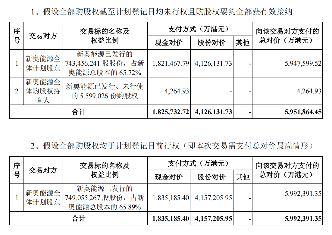 根据新百利出具的《H股估值报告》、交易方案等情况,假设于计划登记日全部购股权均未行权,且购股权要约全部获有效接纳,本次交易需支付的新奥股份H股股份及现金付款的理论总价值约为595.19亿港元(约合555.91亿元人民币)。