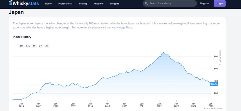 因此,该指数的下行标明日本高端威士忌的交易市场价值普遍缩水,尤其是高权重(即高价)酒款贬值明显。