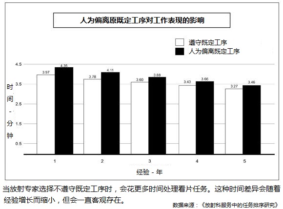 为了找出答案,他们分析了一家大型放射服务公司2005年7月到2007年12月的近276万份相关员工效率数据。通常不同类型的片(包括X射线、CT、MRI、超声波等)是由公司中央排序系统分配的,而专家工作就是不断地看片及作出相关诊断。由于放射科专家的一切工作都在计算机内完成,研究员们得以跟踪每张片子的接受及处理时间从而作出分析。一般来说,每个专家一次要看5-6张片,而这就是选择区别的地方:公司按照“先到先处理”原则排工序,而专家有按照自己工作习惯决定看片顺序的自由。