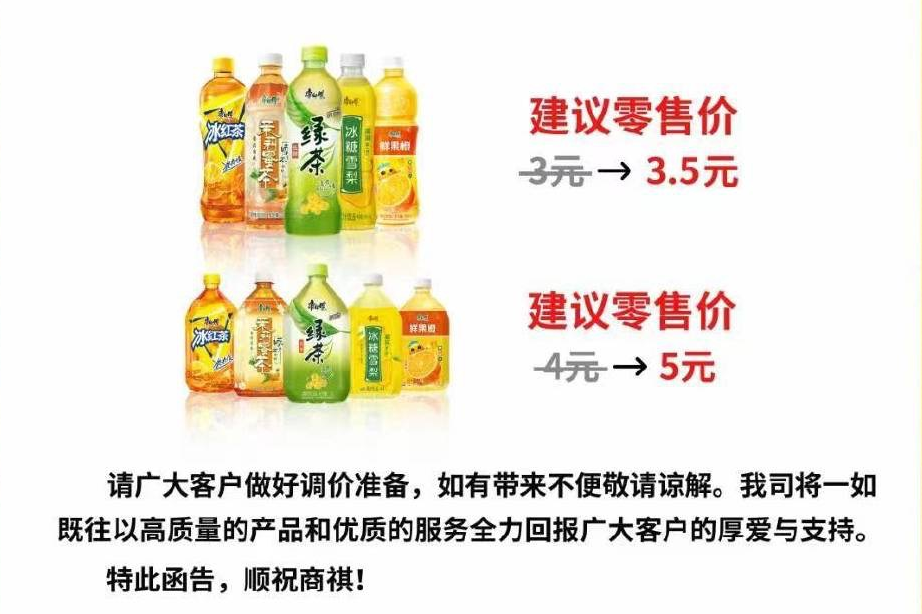 其中,康师傅茶、果汁系列产品中包装零售价由3元/瓶调整为3.5元/瓶,1L装零售价由4元/瓶调整为5元/瓶。