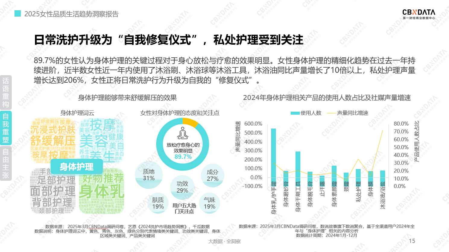 “外御”层面,身体护理被女性升维成品质化“自我修复仪式”。高达89.7%的女性认同其对身心放松的疗愈力。与此同时,日常洗的护精细化程度直接拉满,沐浴油声量同比增长超10倍,私处护理声量更实现 206% 的狂飙,每一个数据都在诉说女性对身体护理的深度投入。