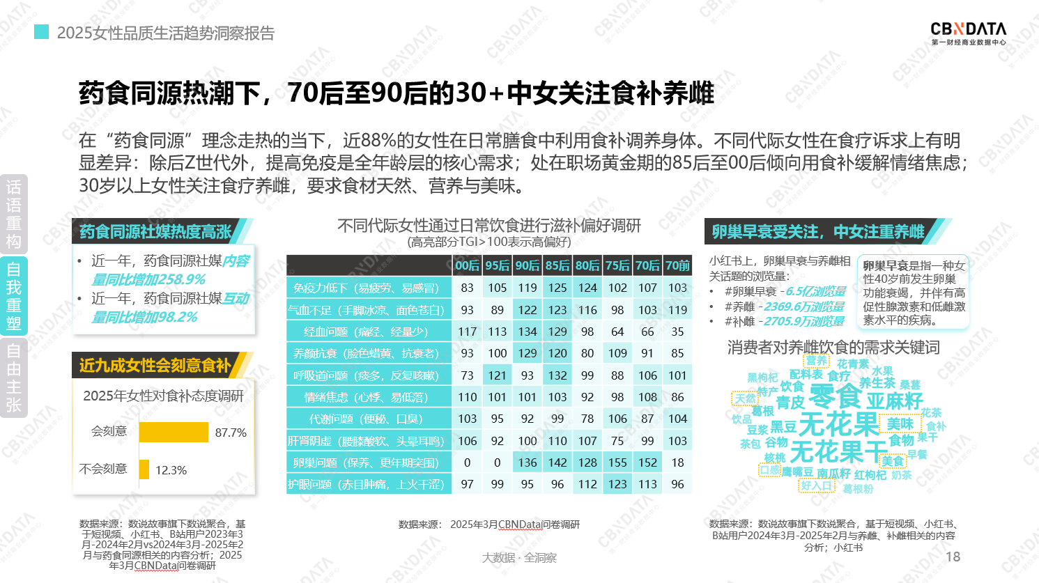 “内调”领域,随着药食同源理念走红,87.7%的女性投身食补养生浪潮。其中,70后至90后的30 +中女对“养雌”关注度拉满,围绕“营养美味”“天然”的需求关键词,将食补养雌的精细化追求展现得淋漓尽致,在一饮一食间书写自我滋养的生活美学。