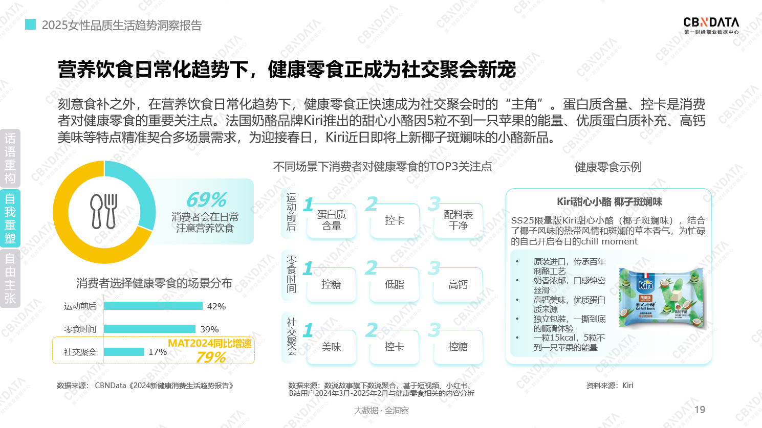 在刻意食补之外,当“you are what you eat”刷屏社交网络,健康零食顺势成为女性健康生活的“新顶流”。《报告》显示,其在众多场景中持续渗透,社交聚会场景的需求更是同比激增79%,在不同场景下,追求零食相应的营养与体验成为每一个健康星人的必备素养,其中,控卡、蛋白质含量成为备受关注的要素。法国奶酪品牌Kiri推出的甜心小酪就是其中具有代表性的健康零食,其即将上新的椰子斑斓味新品,巧妙融合春日氛围与热带风情,为春日里享受生活的女性定制“营养+体验”双buff。
