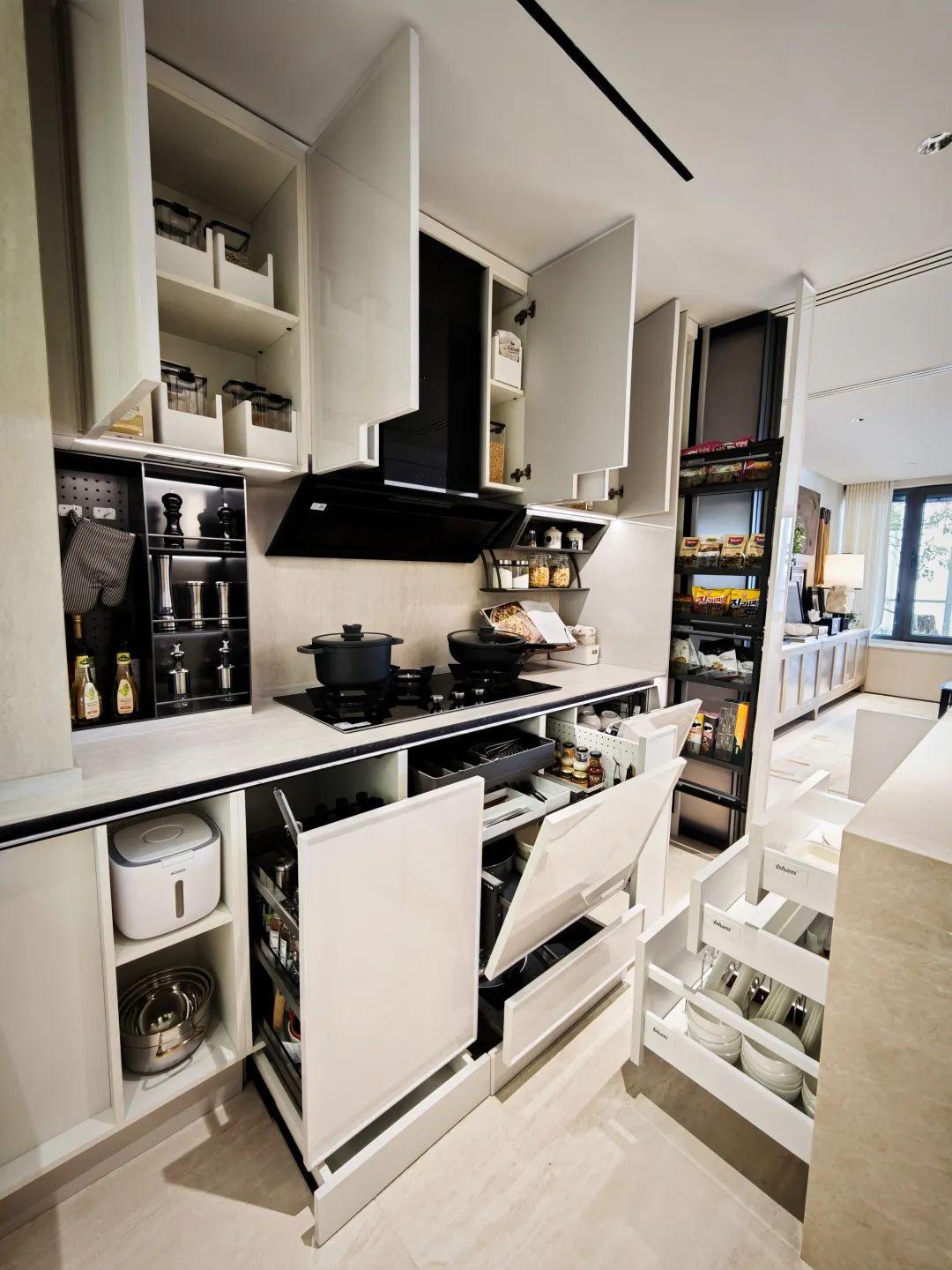 不管是豪宅标配的岛台下缘,还是橱柜的最底端踢脚抽、亦或是冰箱旁边的空隙、甚至是卫生间台盆的下方……都被恰到好处地融入了想不到的收纳细节。