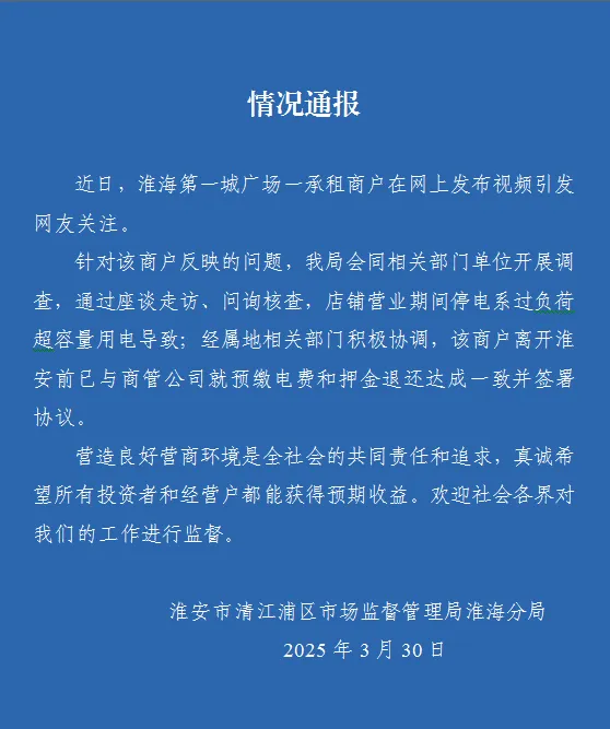 近日,一对东北夫妻发布视频称在江苏淮安花200万开烧烤店疑遭房东“刁难”,亏本返乡,引发关注。淮安市清江浦区市场监督管理局淮海分局3月30日发布情况通报称,近日,淮海第一城广场一承租商户在网上发布视频引发网友关注,针对该商户反映的问题,市监局会同相关部门单位开展调查,通过座谈走访、问询核查,店铺营业期间停电系过负荷超容量用电导致;经属地相关部门积极协调,该商户离开淮安前已与商管公司就预缴电费和押金退还达成一致并签署协议。