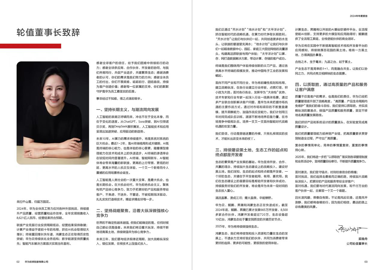 3月31日,华为发布2024年年度报告。报告显示,华为经营结果符合预期,实现全球销售收入8621亿元人民币,净利润626亿元人民币。同时,华为轮值董事长孟晚舟发布年报致辞,强调坚持长期主义,与潮流同向发展,坚持“以质取胜”。致辞全文如下: