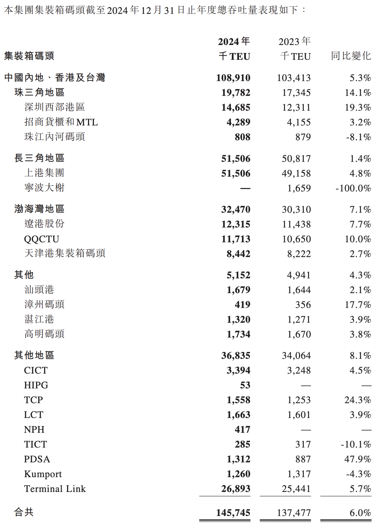 具体来看,2024年,招商局港口的港口项目集装箱吞吐量达到14575万TEU,同比增长6.0%。其中,中国内地、中国香港及中国台湾港口项目完成集装箱吞吐量10891万TEU,同比增长5.3%。财报称,这主要是受益于中国内地的深圳西部港区、长三角地区和环渤海地区的集装箱吞吐量增长。