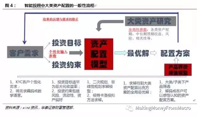 但理财君还是要给小伙伴们展示一下智能投顾的核心理念。华泰证券认为,里面包括几个模块:(1)客户需求模块;(2)资产配置模型;(3)产品评价模型。