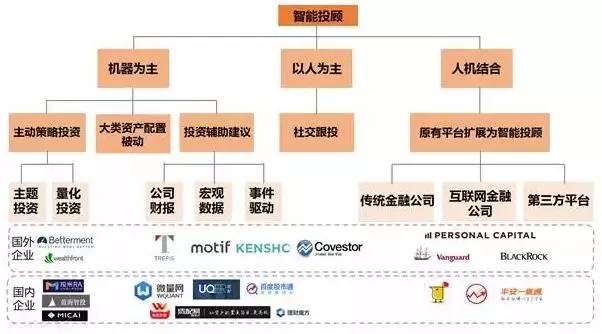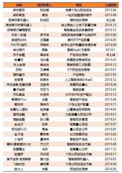 银行背景的有招商银行的摩羯智投,上市公司背景的有京东智投、平安一账通、宜信财富的投米RA,基金公司背景的有广发基金的基智理财、天弘基金的风向篮子,券商背景的有国泰君安的君宏理财、智慧金融、海通证券的e海通财、广发证券的贝塔牛、华泰证券的Assetmark,创业公司包括:璇玑、蓝海智投、理财魔方、拿铁理财、财鲸、弥财、钱景、聚爱财、懒财网、七分钟理财、资配易、金贝塔、慧理财APP、财鱼管家、微量网、量子金服等,可谓遍地开花。