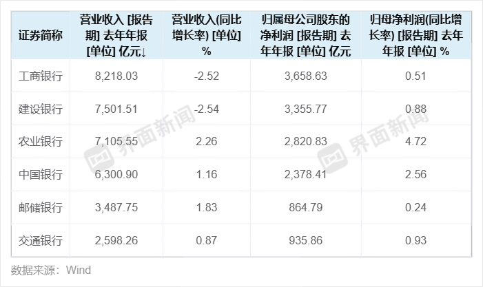 此外,农业银行、中国银行、邮储银行和交通银行均实现营收增长,其中,增速最快的是农行。