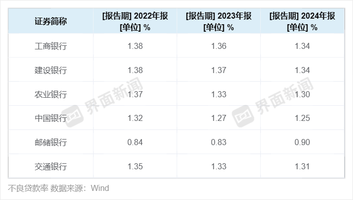 而从国有行整体资产质量来看,5家银行不良率整体下降,虽然邮储银行不良率小幅上升,但不良率水平依然是所有大行中最低的。
