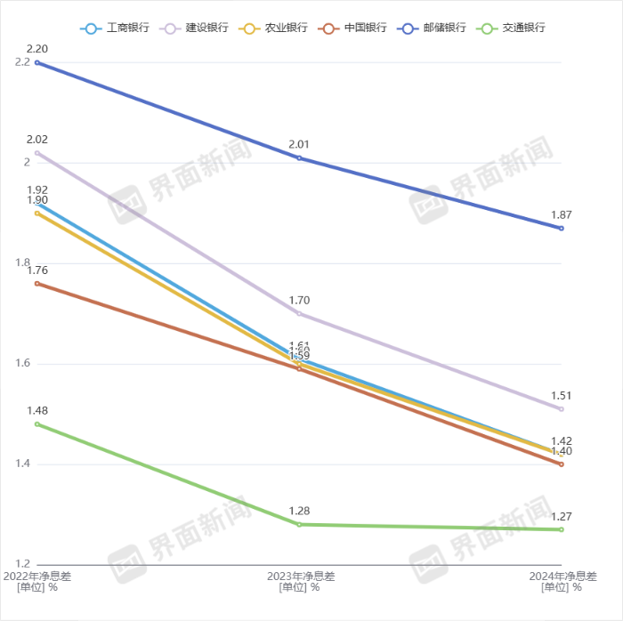 在六大行中,邮储银行净息差最高,为1.87%,不仅在绝对值上排在六大行首位,且降幅仅次于交行;建设银行以1.51%位居第二;农业银行、工商银行和中国银行的净息差分别为1.42%、1.42%和1.4%;交通银行净息差最低,为1.27%。