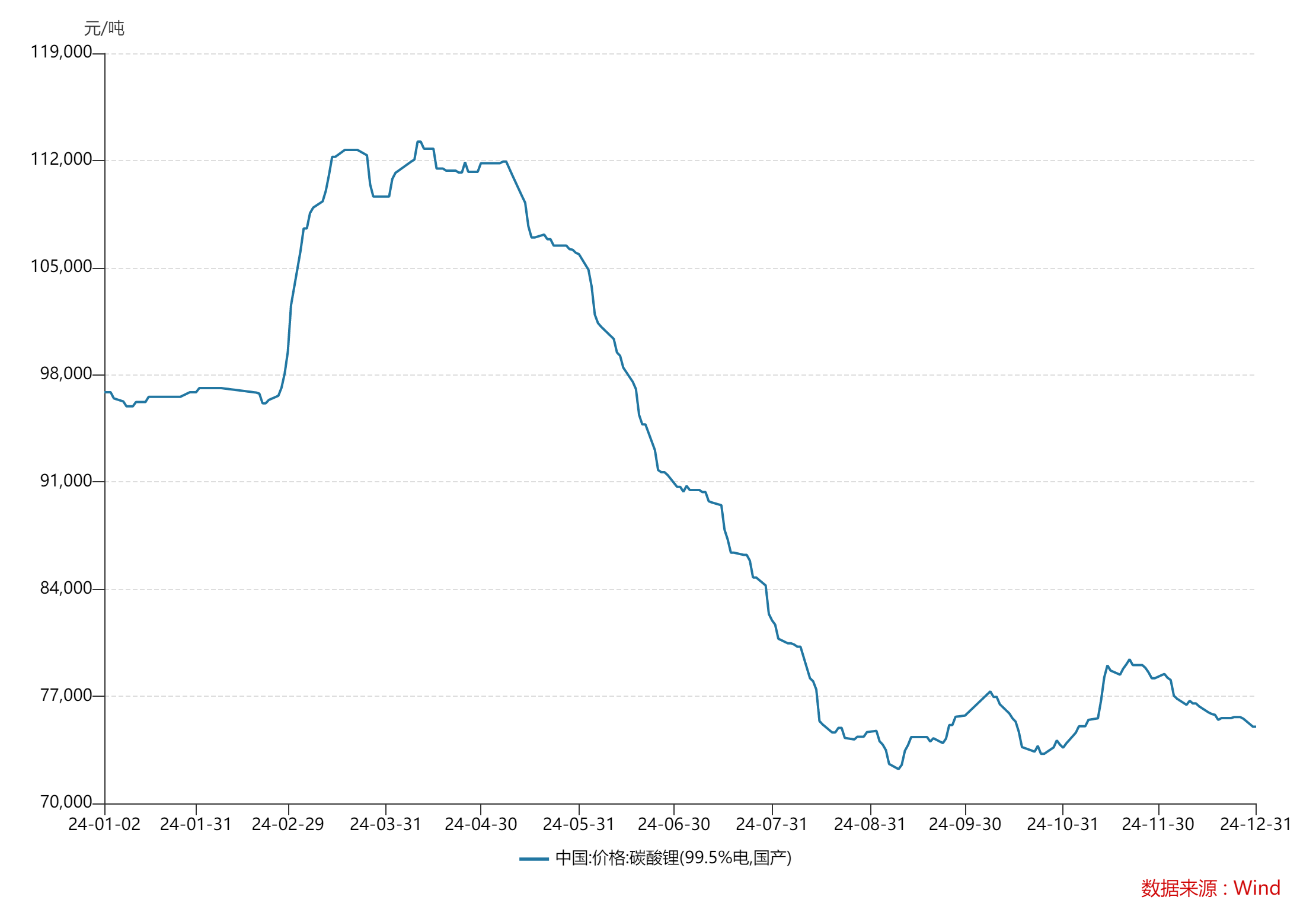 过剩是2024年锂资源的主题。锂行业完全由卖方市场转向买方市场,虽没有继续2023年的暴跌,但电池级碳酸锂价格由年初的9.69万元/吨一路下跌至2024年底的7.5万元/吨,跌幅达23%,续创2022年以来碳酸锂价格新低。