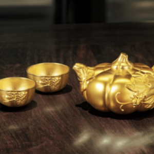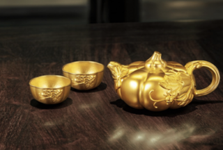 围绕古法金工艺,多年来老铺黄金形成六大核心自研工艺。其中,花丝镶嵌工艺早在2008年就被列入国家非物质文化遗产名录。另以老铺黄金金壶使用的“一张打”为例,该工艺为唐代锤揲工艺的特殊形式,壶身、壶底、壶嘴均由一张金片或银片打造而成,完全没有焊接。这在保留自然手工纹理的同时,兼具人文气息和艺术审美。现收藏陕西历史博物馆的鸳鸯莲瓣纹金碗,就是采用该工艺制成。
