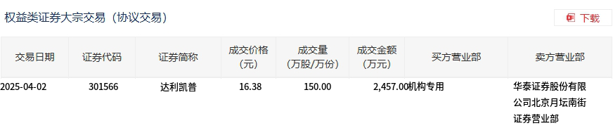 4月2日,达利凯普大宗交易成交150万股,成交额2457万元,占当日总成交额的17.01%,成交价16.38元,较市场收盘价16.5元折价0.73%。