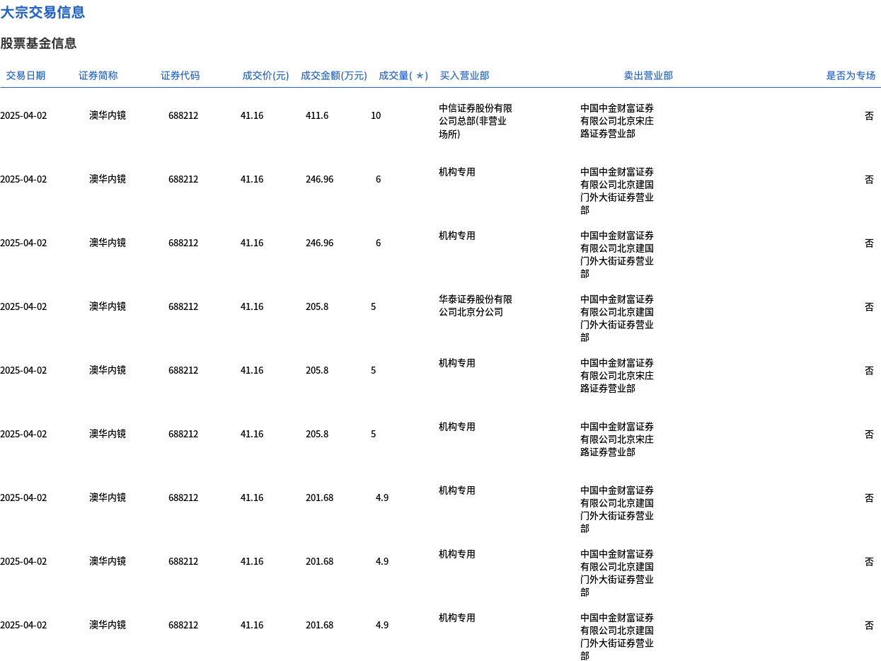 4月2日,澳华内镜大宗交易成交51.7万股,成交额2127.96万元,占当日总成交额的21.97%,成交价41.16元,较市场收盘价44.56元折价7.63%。