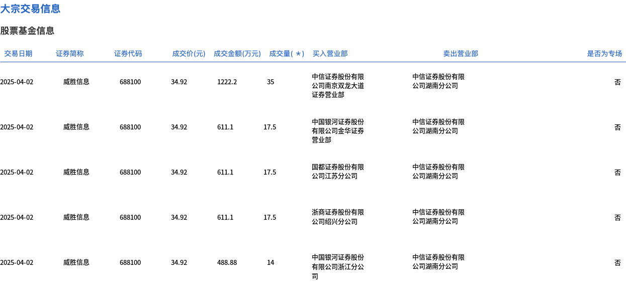 4月2日,威胜信息大宗交易成交101.5万股,成交额3544.38万元,占当日总成交额的25.37%,成交价34.92元,较市场收盘价39.08元折价10.64%。