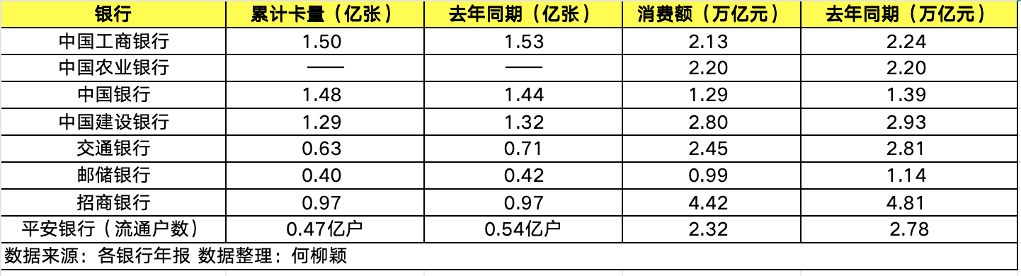 年内消费额同样萎缩,尤其是两大股份行。招商银行2024年信用卡消费额4.42万亿元,较2023年减少了约3900亿元;平安银行2024年信用卡消费额2.32万亿元,较2023年减少了约4600亿元。