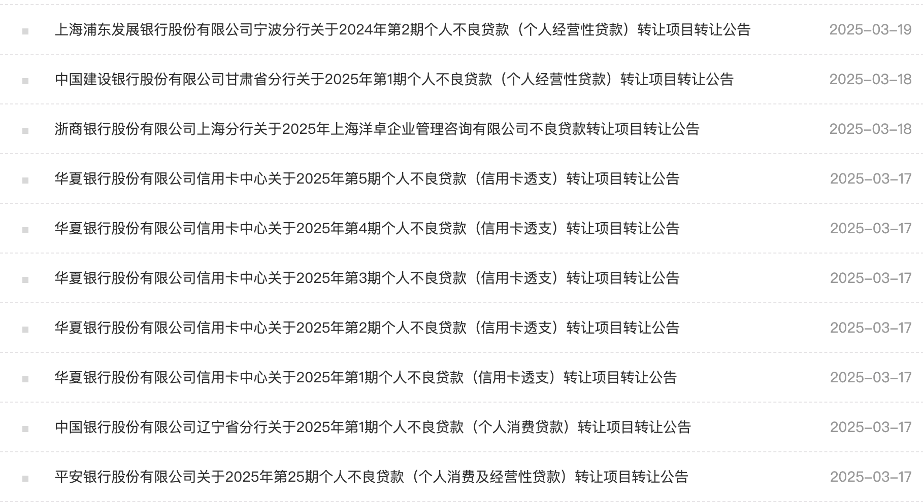 值得一提的是,优化结构之外,银行正加快出清不良资产以优化个贷业务。在银登中心,多个信用卡透支项目、个人消费贷项目挂牌转让。