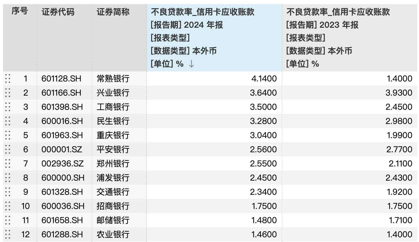 资产质量方面,普遍出现恶化趋势。其中,常熟银行信用卡不良率从2023年末的1.40%骤然上升至4.14%,重庆银行也从2023年末的1.99%上升至3.04%。