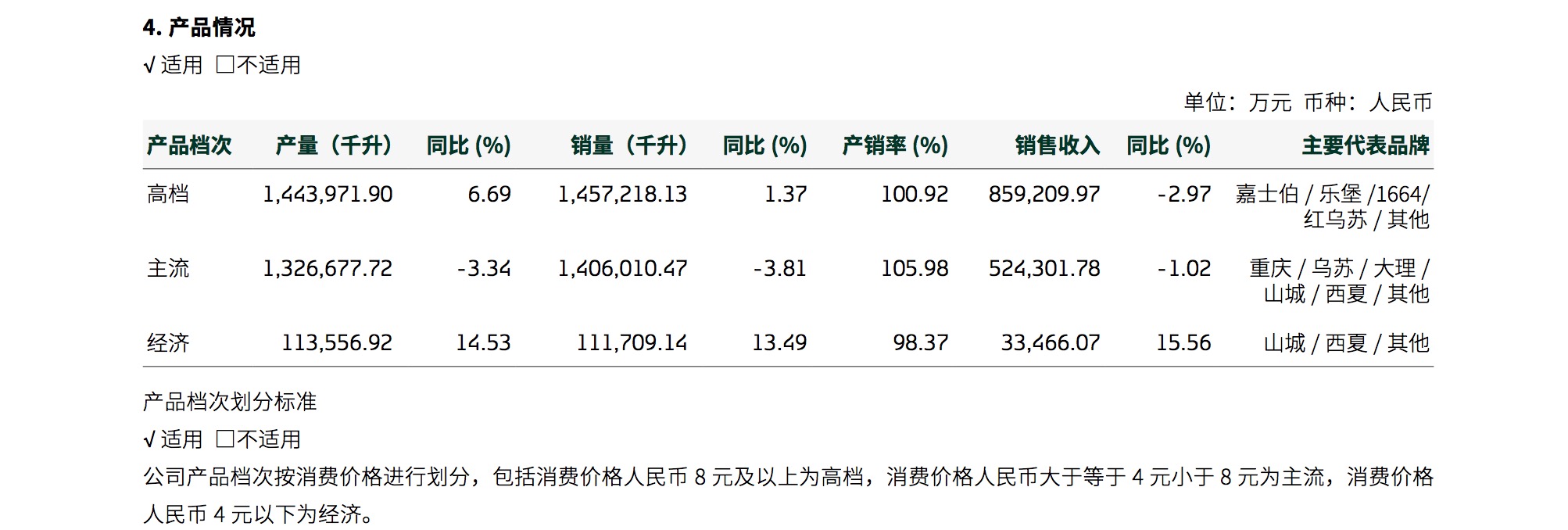 高档产品(8元及以上)销量为145.72万千升,同比增长1.37%,占比提升至48.9%。从啤酒产品档次营收而言,重庆啤酒8元及以上的高档产品销售收入85.92亿元,同比收窄2.97%;4至8元的主流产品销售收入52.43亿元,亦出现1.02%同比下降。