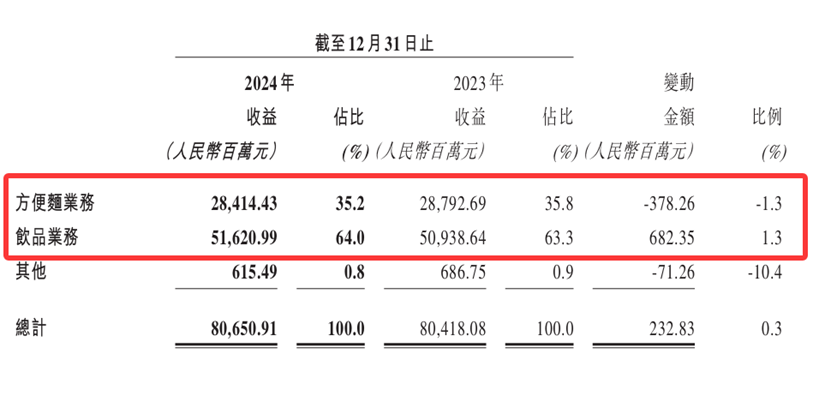 尽管康师傅在2024年实现了净利润双位数增长,但从细分业务来看,康师傅的方便面业务遭遇了不小的挑战。