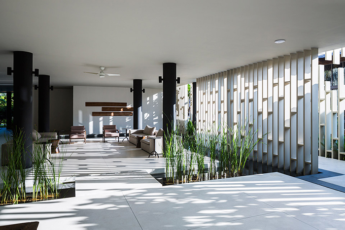 决定一个地区建筑风格的最大因素莫过于本国人的生活方式。越南属热带季风气候,主要的降雨集中在夏季,高温时期湿热难耐,保持室内的凉爽、通风是当地的主要诉求。因此很多越南建筑师会想办法让房屋通透,并增加绿植、池堂进行降温,这样一来,室内也可以为当地人节省空调开支。