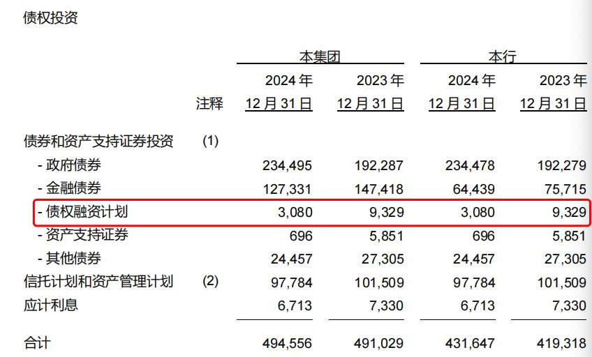 “高风险高收益”调整为“低风险均收益”的资产配置策略在金融投资上也有体现。财报数据显示,2024年浙商银行“债权融资计划”相比上年大幅下降6000多亿元,“信托计划和资产管理计划”也有下降。这些项目一般是高风险高收益的非标资产,而在非标资产下降的同时,政府债券和同业存单余额上升,后者风险较低但收益稳健。