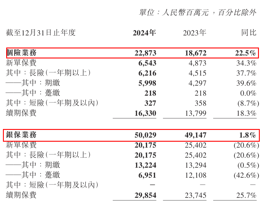 分渠道来看,2024年,阳光人寿个险业务实现总保费收入228.7亿元,同比增长22.5%,其中新单期缴保费收入60.0亿元,同比增长39.6%。