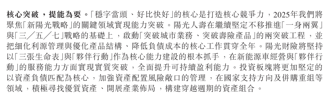 阳光保险创始人、董事长张维功在年报致辞中称,2024年阳光保险坚持“好中求进”的价值发展理念,“新阳光战略”全面启动并有序推进,2025年将聚焦“新阳光战略”的关键领域实现能力突破。