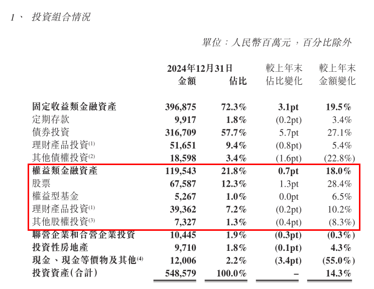 权益类金融资产占比为21.8%,投资金额达1195.4亿元,同比增长18%;股票类投资金额为675.9亿,同比大增28.4%。